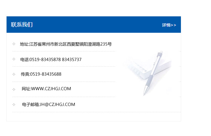 地址:常州市新北區友邦商務大廈1幢16、17層  電話:0519-85101652  傳真:0519-85112595  郵編:213022  網址:www.cz-jiayue_cn.she-well.com  郵箱:xiajifengaa@163.com